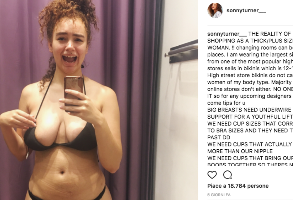 Sonny Turner, modella curvy di 19 anni, ha usato queste parole per denunciare il disinteresse delle case di moda nei confronti delle clienti più formose e lo ha fatto attraverso un post su Instagram. Turner, seppur molto giovane, ha le idee ben chiare e si fa così portavoce di una difficoltà molto diffusa tra le donne con qualche chilo in più o che hanno semplicemente un seno più grande. “Un seno grande ha bisogno di un supporto consistente. Meritiamo più scelta nella selezione dei colori per i costumi oltre il generico nero. Avremmo bisogno che la smetteste di usare modelle con il seno finto che non rappresenta la realtà e non ci rappresentano”, il commento piccato della giovane modella. “Le case di moda vogliono realizzare i costumi solo in tre tipologie e pensano che tutte le donne debbano rientrare in quelle misure. Ma la verità è che abbiamo corpi differenti che necessitano di essere coperti e supportati in modo più personalizzato”, ha concluso.