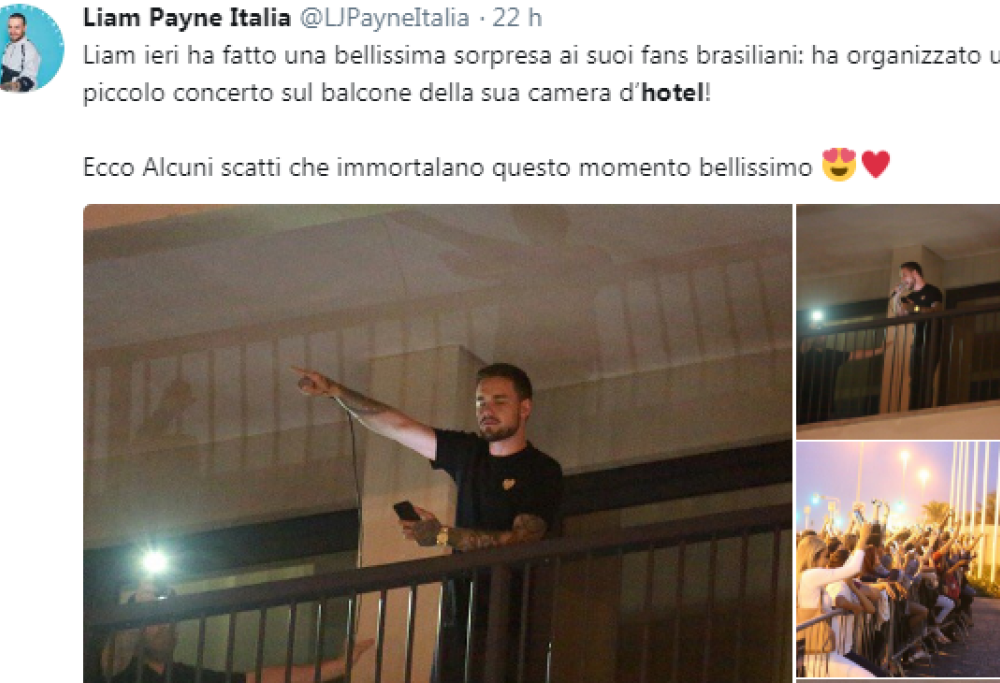 Dalla terrazza del suo albergo a Rio de Janeiro, Liam ha cantato una serie di canzoni tra cui Familiar (con J Balvin, il brano che era andato in Brasile a promuovere), Strip That Down, Bedroom Floor e ha aggiunto anche due canzoni degli One Direction: Little Things e History. Insomma, ha creato un bel mood intorno a sé, in attesa che arrivino anche le classifiche. Il 14 settembre uscirà il suo atteso album da solista.