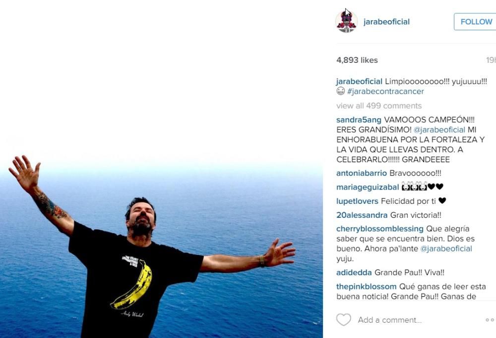 Classe 1966, Pau Jones, leader dei Jarabe de Palo, è appena rinato. Poche ore fa, infatti, i suoi fan hanno letto su Facebook il “post” più atteso, arrivato poco dopo una fotografia che lo ritraeva sul lettino di una Tac, la Tac decisiva dopo sei mesi molto dolorosi. “Limpio!”, cioè “Pulito”, ha esclamato sul popolare social network il musicista spagnolo che tutto il mondo, Italia inclusa, ha conosciuto 15 anni fa grazie alla hit “La Flaca” (seguita, un paio d’anni dopo dal tormentone “Depende”). Accanto a quella scritta, un selfie che lo ritrae radioso, esultante, pieno di gratitudine, davanti a uno splendido scorcio di mare con una t-shirt dei Velvet Underground, le braccia aperte in segno di gratitudine e gli occhi chiusi.