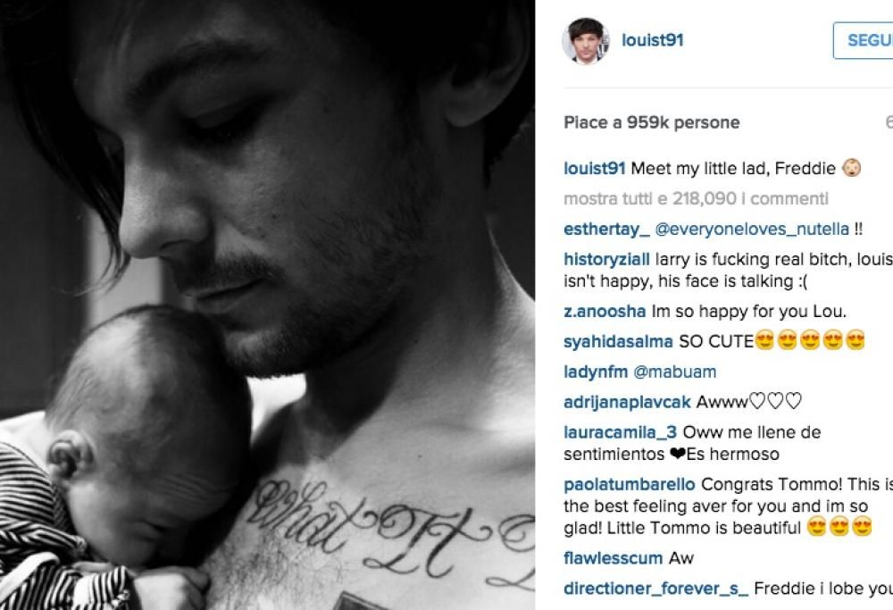 Louis Tomlinson: prima foto insieme al figlio. Il cantante degli One Direction ha pubblicato la prima foto che lo ritrae insieme a suo figlio. Louis è diventato papà la scorsa settimana quando la stilista Briana Jungwirth ha dato i natali al piccolo Freddie. I due non sono una coppia ma solo buoni amici e Louis ha dimostrato di essere davvero al settimo cielo dopo la nascita del piccolo. Ora ha deciso anche di condividere la sua gioia con tutti i suoi fan in giro per il mondo. Il cantante ha rivelato anche il nome del piccolo che è Freddie invece di Sydney come era stato erroneamente riportato in un primo momento: “Incontrato il mio ragazzo, Freddie. Grazie a tutti per i vostri messaggi di auguri”, ha scritto dal social.
