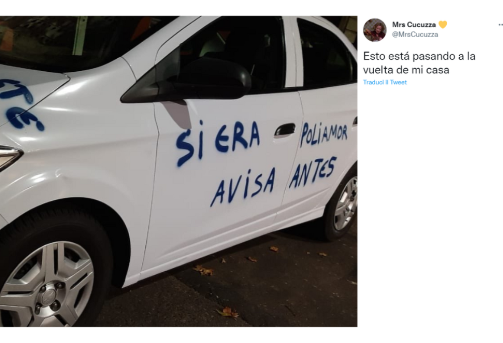 Mai fare arrabbiare una donna. E invece il proprietario dell’auto di cui stiamo per parlarvi deve averla combinata grossa. La sua auto bianca un giorno è stata ricoperta di scritte; sul cofano si legge: “Visto che mi hai bloccata, ti scrivo qui”. E poi sulle fiancate altre scritte che chiariscono l’accaduto: “Una relazione aperta dovrebbe essere accettata da entrambi”, sulle porte laterali di destra, “se era poliamore, forse prima dovevi avvertire”, sulla porta di sinistra. Evidentemente tra la coppia c’è stato un misunderstanding sulle regole della relazione. Il proprietario deve aver tradito la ragazza e lei non ha gradito, anche perché dopo il fattaccio, lui ha anche deciso di bloccare su whatsapp. Così lei ha optato per un messaggio chiaramente visibile e inequivocabile.