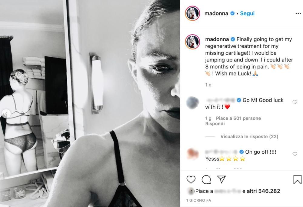 Madonna ha postato alcune foto per festeggiare l’operazione che dovrà affrontare per ricostruire la cartilagine mancante al ginocchio, per cui ha sofferto molto negli ultimi mesi. Ma alcuni suoi follower non hanno molto apprezzato le foto della cantante, accusandola di essere rifatta “dalla testa ai piedi“.