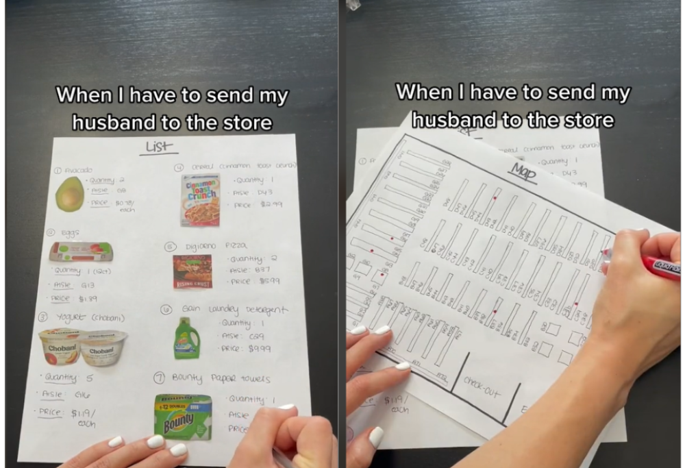 Per alcune persone fidarsi di qualcun altro è davvero difficile, soprattutto quando si tratta di faccende di casa; la storia di questa donna che manda il marito a fare la spesa ne è l’esempio lampante. Prima di mandarlo al supermercato non gli ha preparato una semplice lista della spesa con un elenco puntato di ciò che serviva, ma si è adoperata per fornirgli una lista illustrata dei prodotti con tanto di mappa per localizzare all’interno del supermercato: una vera lista della spesa for dummies. Ovviamente la moglie ha colto l’occasione per documentare il suo lavoro certosino con un divertente video su TikTok che ha aperto il dibattito sui mariti che fanno la spesa: era davvero necessario fornire una guida del genere oppure l’uomo è stato sottovalutato? Qualcuno di molto severo ne ha approfittato per commentare: “fai prima a divorziare da lui che mandarlo a fare la spesa”; altri meno drastici suggeriscono “fai prima ad andare tu a fare la spesa”. A guardarla bene la lista è davvero semplice: avocado, pizza surgelata, uova, niente di difficile da trovare in un qualsiasi supermercato insomma. Il marito in questione deve essere un caso disperato.