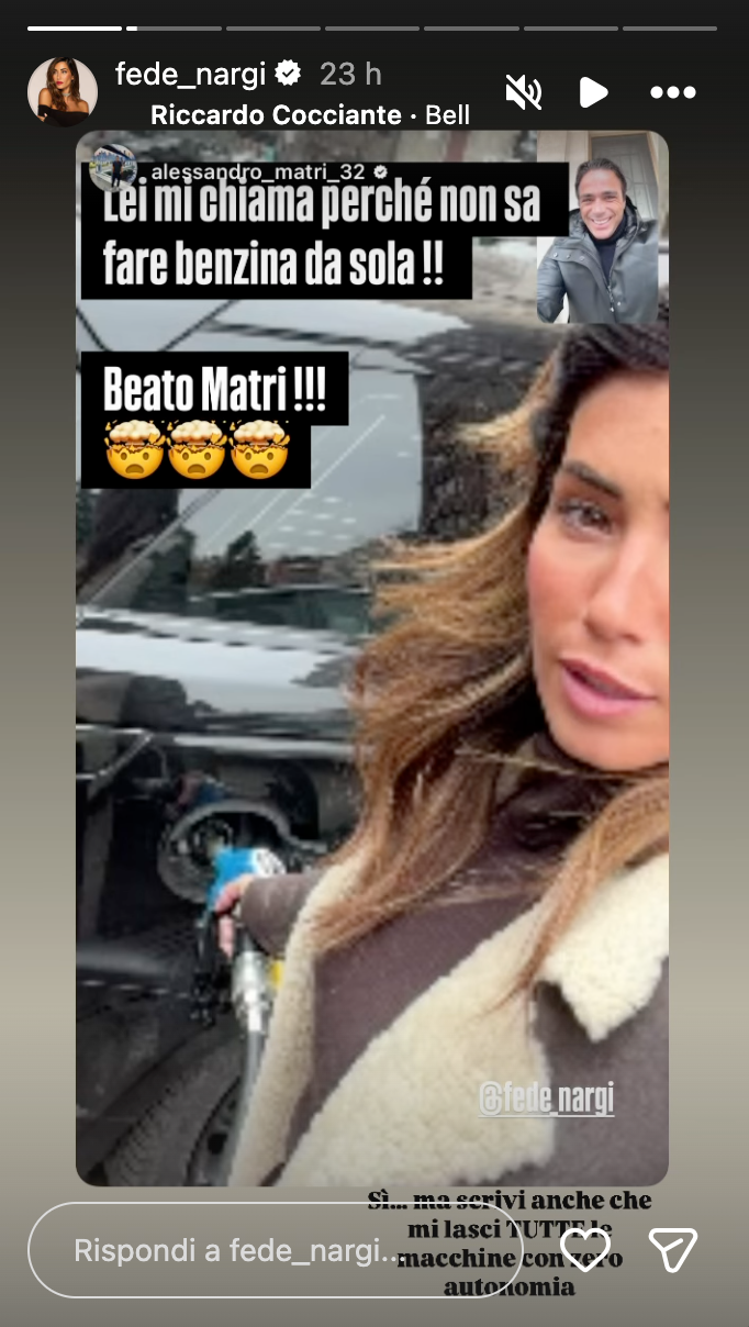 L’ultimo in ordine di tempo è stato proprio ieri quando Matri ha pubblicato una storia Instagram che ritraeva una breve videochiamata con la compagna. Il post recitava: “Lei mi chiama perché non sa fare benzina da sola!!” seguito dal suo immancabile commento “Beato Matri”. La frase, ironica e giocosa, riprende uno dei tormentoni legati alla coppia: il riconoscimento della bellezza e simpatia di Federica Nargi, ma senza dimenticare le piccole imperfezioni quotidiane.
