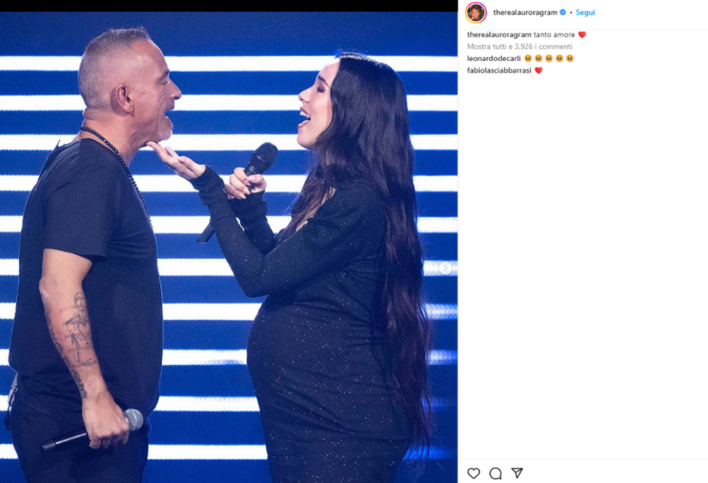 “Volevo approfittare per dirti una cosa che non ho mai trovato il tempo e il modo giusto di dirti – ha ironizzato Aurora -: aspetto un bambino”. E il padre ha replicato serio: “Sei una forza della natura, una roccia, io di questo sono davvero orgoglioso di te”. Poi Michelle e Eros hanno improvvisato un siparietto: “Pronto a diventare nonno?”, ha chiesto la conduttrice. “Prontissimo”, ha ribattuto Eros. Aurora ha poi raccontato del momento in cui ha svelato al papà di aspettare un bimbo: “Non dimenticherò mai la tua reazione quest’estate – ha detto -, ho preso una maglietta con scritto ‘nonno loading’ e lui ha reagito svenendo“.