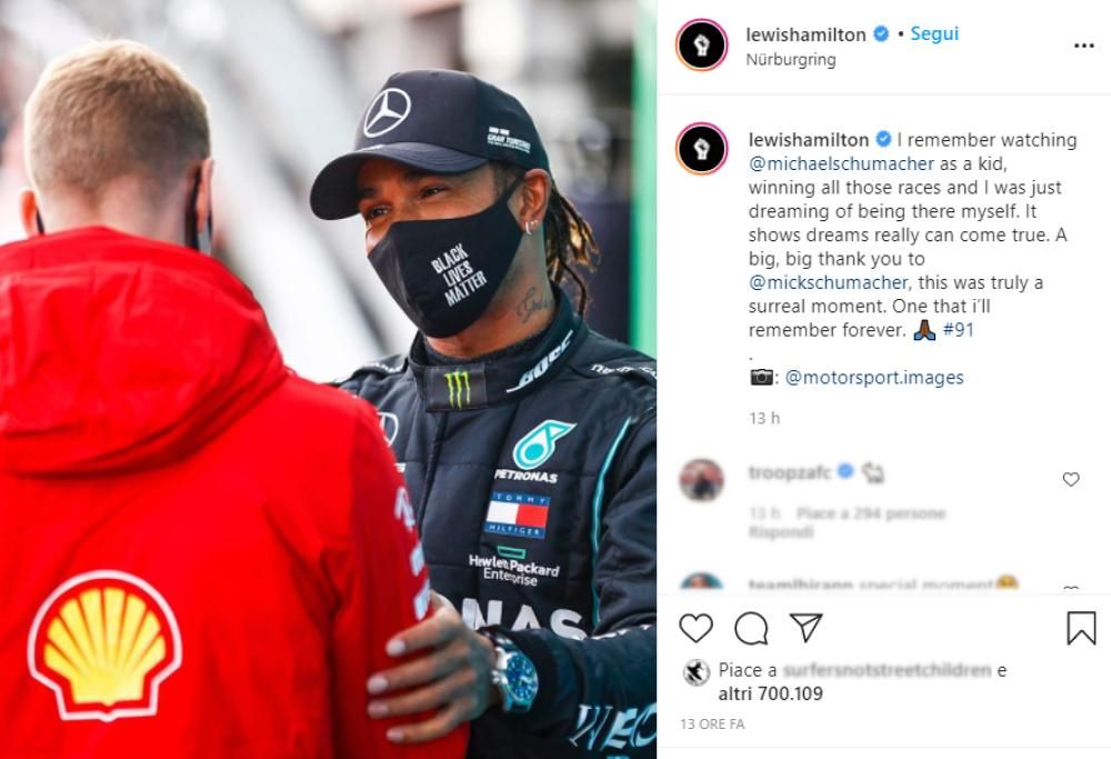 In una intervista post gara, Hamilton si è detto onorato per il gesto della famiglia di Michael: “Ringrazio Mick e la sua famiglia per il bellissimo gesto. L’ho apprezzato molto e un po’ mi ha lasciato senza parole. Sono cresciuto con il mito di Schumi… ricordo quando giocavo con Michael nei videogiochi. Non pensavo di poterlo avvicinare o eguagliare… me ne sono accorto tornando in pit lane. Se oggi sono arrivato a questo punto lo devo molto alla mia scuderia e a tutti i nostri collaboratori“.