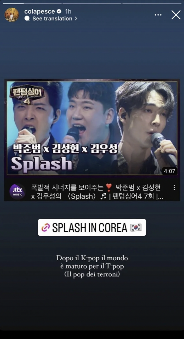 È successo, infatti, durante un’esibizione del trio Penguin in the water formato da Junbeom Park, Seonghyun Kim e Woosung Kim: i tre, con evidente formazione lirica (un po’ Il Volo in salsa coreana), hanno portato a una puntata della quarta edizione di Phantom Singer, talent show sudcoreano trasmesso su JTBC, nientemeno che Splash dei “nostri” Colapesce Dimartino.