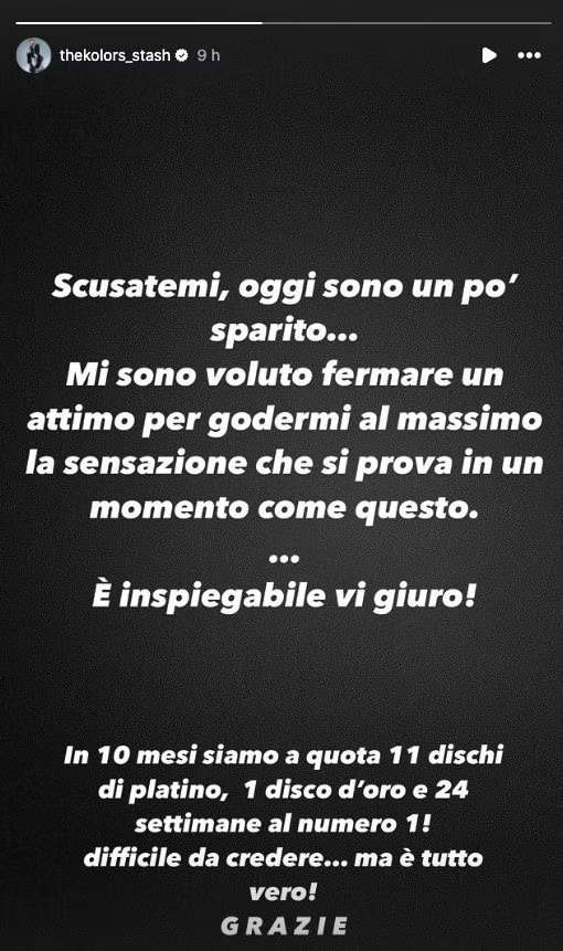 Di fronte a un traguardo così importante e inaspettato persino il frontman dei The Kolors è rimasto senza parole e si è preso qualche ora di pausa dai social per realizzare ciò che stava accadendo. Poi, è tornato su Instagram per raccontare tutte le sue emozioni e ringraziare i fan del supporto: “Scusatemi, oggi sono un po' sparito… - ha scritto Stash - Mi sono voluto fermare un attimo per godermi al massimo la sensazione che si prova in un momento come questo… È inspiegabile, vi giuro!”. Il successo dei The Kolors verrà celebrato con due attesissimi live: il primo sarà il 3 aprile al Forum di Assago di Milano, e a seguire si esibiranno all’Auditorium Parco della Musica - Cavea di Roma il 20 giugno.