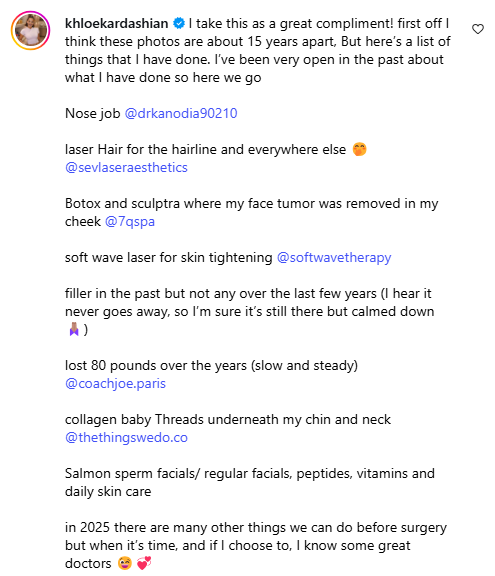 Khloé ha deciso di rispondere con un commento diretto: “Lo prendo come un grande complimento! Prima di tutto, penso che queste foto risalgono a circa 15 anni fa, ma ecco un elenco di tutti i ritocchi che ho fatto”.