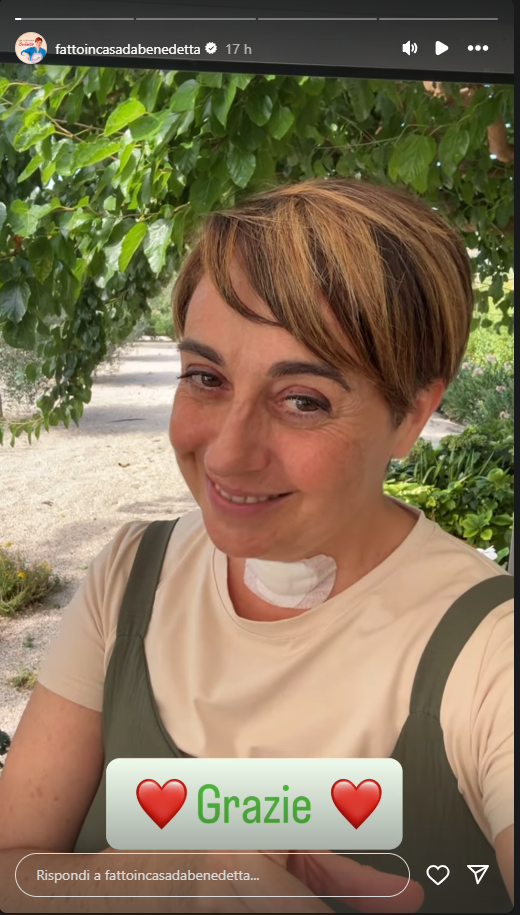 Dopo l'intervento alla tiroide, Benedetta Rossi è tornata a parlare con i suoi fan attraverso i social, aggiornandoli sulle sue condizioni di salute. La nota cuoca e conduttrice di Fatto in casa da Benedetta si è mostrata in un breve video girato nel giardino di casa, spiegando come sta andando il recupero post-operatorio.