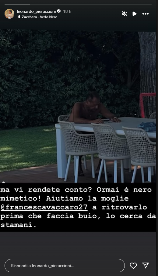 Ma Pieraccioni non si è fermato qui. Ha proseguito lo scherzo con una storia su Instagram, trasformando l'aneddoto in un finto "appello" rivolto ai suoi follower. Ha lanciato una sorta di ricerca per l'amico scomparso, scrivendo: "Ormai è nero mimetico! Aiutiamo la moglie Francesca Vaccaro a ritrovarlo prima che faccia buio, lo cerca da stamani!".