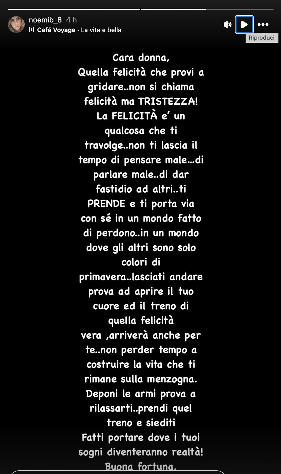 Queste parole, seppur non confermate come indirizzate a Ilary, hanno sollevato un interrogativo: è davvero possibile che Noemi stia lanciando una frecciata alla conduttrice? Oppure si tratta di un messaggio generale, frutto di un momento di introspezione? Quel che è certo è che la riflessione continua con un ulteriore invito alla serenità: “Non perder tempo a costruire la vita che ti rimane sulla menzogna. Deponi le armi prova a rilassarti, prendi quel treno e siediti. Fatti portare dove i tuoi sogni diventeranno realtà! Buona fortuna”.