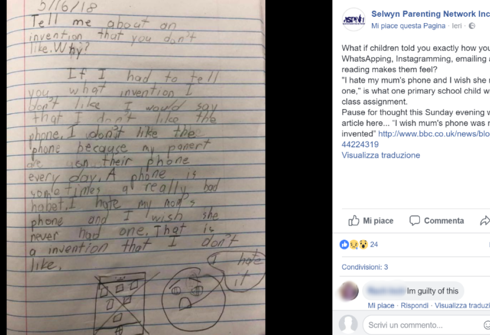 L’elaborato è stato pubblicato su Facebook dall’insegnante, Jen Beason, che ha dichiarato che su 21 alunni ben 4 hanno dichiarato di odiare gli smartphone dei loro genitori. La maestra ha accompagnato il suo post con l’hashtag: “#listentoyourkids”, ovvero “ascoltate i vostri bambini”.