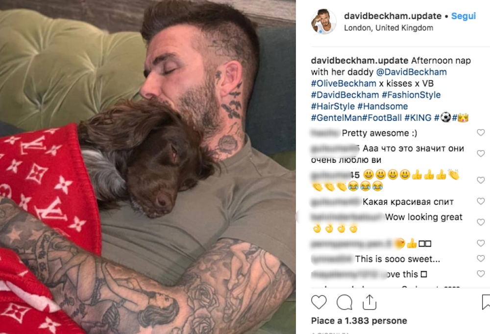 Non c’è niente di meglio di un bel pisolino con il papà. Sembra proprio questo il pensiero di Olive, il cocker spaniel inglese di David e Victoria Beckham, immortalato in un momento “intimo” con il suo padrone. La foto è stata pubblicata su Instagram e ha fatto il pienone di like: piace a oltre un milione e trecento follower! Nello scatto si vedono David e Olive sdraiati sul divano, teneramente abbracciati, mentre schiacciano un pisolino pomeridiano. E come ogni siesta che si comanda, a scaldare la cagnolina c’è una coperta… ma una qualsiasi! Si tratta, infatti, di una copertina griffata costata oltre 5 mila euro. Olive è davvero una pelosetta fortunata.
