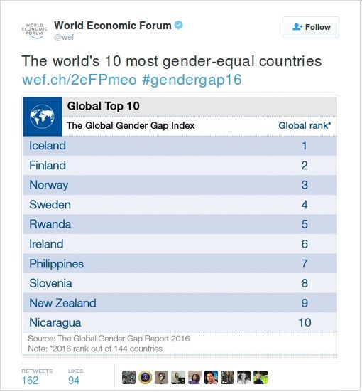 Per il 2016 la medaglia d’oro per la parità dei generi va all’Islanda, quella d’argento alla Finlandia e quella di bronzo alla Norvegia. Il Paese non europeo che ha raggiunto il punteggio più elevato è il Rwanda al quinto posto, seguito dalle Filippine (settimo), Nicaragua (decimo), Canada (39esimo) e Israele (49esimo).
