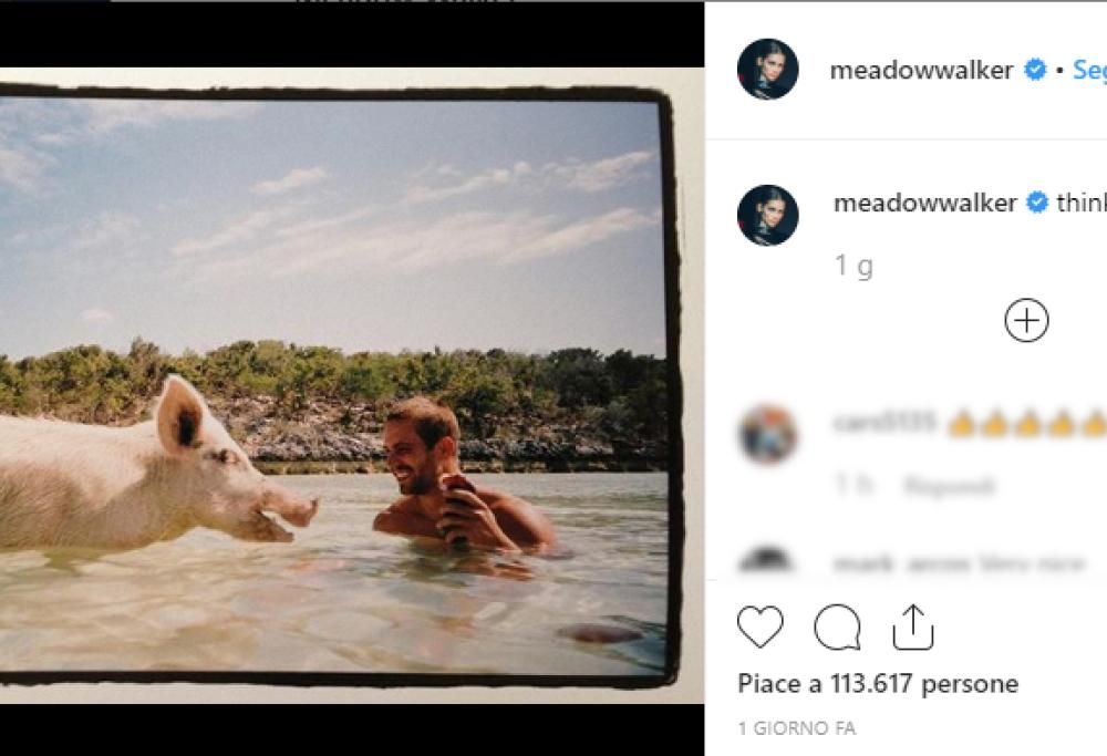 Meadow, la figlia 20enne di Paul Walker e Rebecca Soteros, sabato scorso ha condiviso su Instagram un dolce ricordo di suo padre. Una foto che ritrae la star di Fast And Furious mentre nuota nell’oceano e si ritrova faccia a faccia con un maiale.