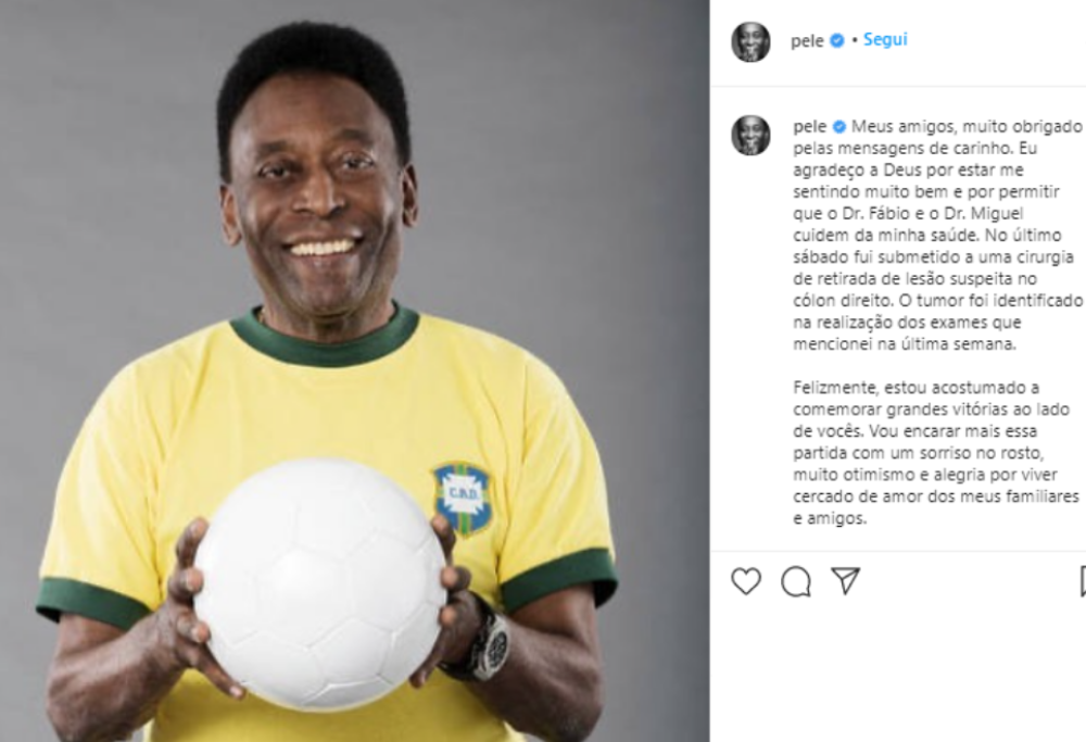 Pelè è ricoverato dal 31 agosto all’ospedale Albert Einstein di San Paolo, ora il motivo è stato reso pubblico e sarebbe un tumore al colon per cui il campione è stato operato: “Il tumore è stato identificato durante gli esami cardiovascolari e di laboratorio di routine e il materiale è stato inviato al laboratorio per l’analisi istologica”, ha affermato il personale ospedaliero. O Rey ha quasi 81 anni e li compirà il 23 ottobre. Tutt’altro che abbattuto da questa brutta notizia, Pelè ha già rassicurato i fan attraverso i social: “Amici miei, grazie mille per i gentili messaggi. Ringrazio Dio perchè mi sento bene e per aver permesso al Dr. Fábio e al Dr. Miguel di prendersi cura della mia salute. Sabato scorso sono stato operato per rimuovere una lesione sospetta al colon destro. Il tumore è stato identificato durante i test di cui ho parlato la scorsa settimana. Per fortuna, sono abituato a festeggiare grandi vittorie con voi. Affronterò questa partita con il sorriso sulle labbra, tanto ottimismo e gioia di vivere circondato dall’amore della mia famiglia e dei miei amici”.