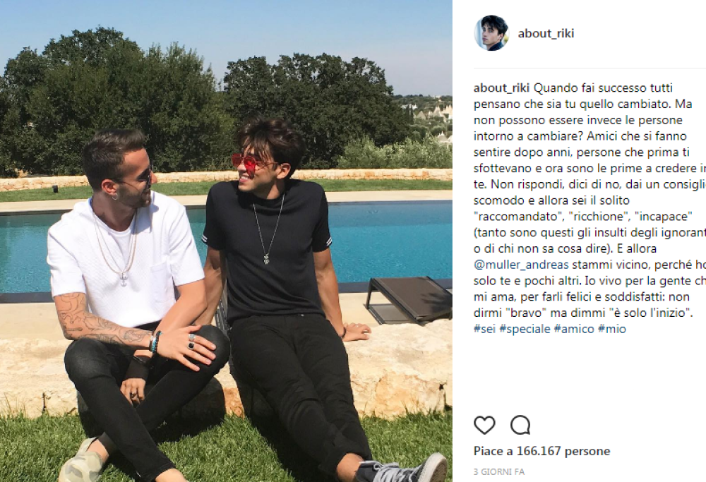 Nonostante i successi (come il primo posto Fimi e il doppio platino per il suo EP di esordio “Perdo le parole“), c’è molta amarezza in questo momento nell’animo di Riki, come ha mostrato in un un lungo sfogo su Instagram, didascalia a una foto con il suo amico Andreas Muller, anche lui reduce da Amici: “Quando fai successo tutti pensano che sia tu quello cambiato. Ma non possono essere invece le persone intorno a cambiare?“, si chiede Riki nel suo post.