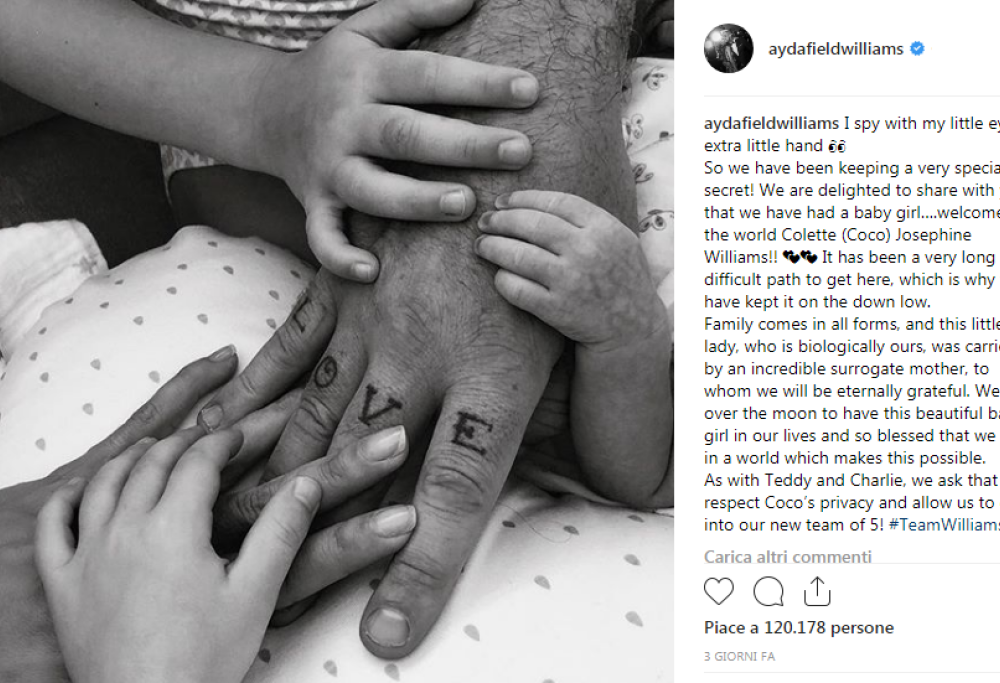“È stata lunga e difficile la strada per arrivare qui“, ha confessato Ayda nel post, una foto con le mani di tutta la famiglia. “La famiglia arriva in tutte le forme“. I due esprimono “eterna gratitudine” alla madre surrogata. Dopo l’annuncio, Ayda ha chiesto privacy: per sé, per Robbie, per Teddy e Charlie (gli altri due figli, sei e quattro anni) e soprattutto per la piccola Coco. “Permettete a questa nuova squadra di cinque componenti di crescere“.