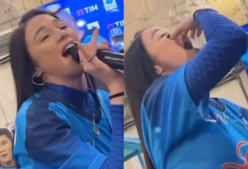 Per lei un outfit completamente azzurro: maglia, gonna e borsa con i colori del Napoli e indosso l’immancabile maglia della squadra. A ritrarre il momento un video pubblicato su TikTok che sta facendo il giro del web e che la mostra mentre canta la popolare sigla della serie tv.