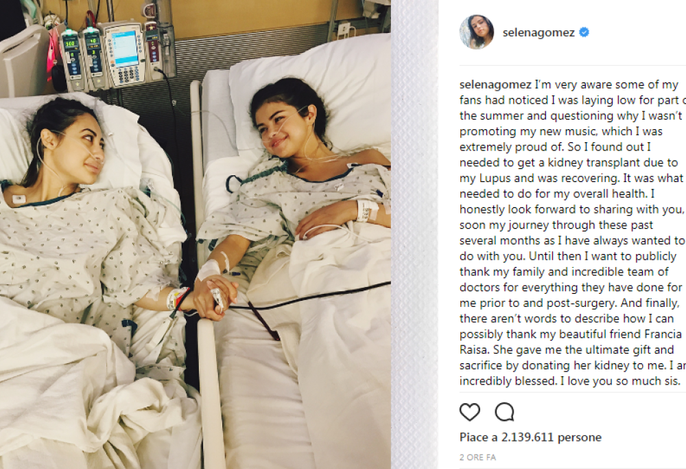 Ora è arrivato un aggiornamento che ha sorpreso tutti coloro che la amano. Sulla propria pagina Instagram, Selena ha comunicato di essersi dovuta sottoporre a un trapianto di rene, e che l’intervento è stato reso possibile grazie alla disponibilità della sua migliore amica che le ha donato l’organo. Il lungo messaggio è stato postato sotto ad una tenerissima foto che mostra le due ragazze sui rispettivi lettini d’ospedale mentre si tengono per mano per darsi forza a vicenda, assieme ad altri scatti che mostrano il fisico della cantante dopo l’intervento.