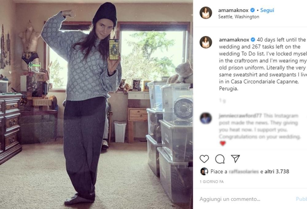 Nella didascalia che accompagna la foto, Amanda scrive: «40 giorni al matrimonio (con Christopher Robinson) e 267 cose da fare in lista. Mi sono chiusa nella sala hobby e sto indossando la mia vecchia uniforme da prigione» – poi aggiunge – «Questi sono gli stessi pantaloni e lo stesso maglione che indossavo quando mi trovavo nella casa circondariale di Capanne, a Perugia».