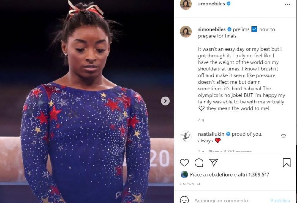 L’atleta ha poi spiegato in conferenza stampa la sua decisione: «Non ho più fiducia in me stessa come prima. Non so se è una questione di età». «Sento che non mi sto divertendo più. So che questi sono i Giochi, volevo farli, ma in realtà sto partecipando per gli altri, più che per me. Mi fa male nel profondo pensare che fare ciò che amo mi sia stato portato via. Non appena salgo in pedana siamo solo io e la mia testa. E lì ci sono démoni con cui devo confrontarmi».Messaggi di consolazione e sostegno sono arrivati in maniera unanime da tutti i colleghi e da varie autorità del mondo; anche la portavoce della Casa Bianca Jen Psaki: “Gratitudine e supporto sono ciò che Simone Biles merita. E’ ancora la più grande di tutti, e siamo tutti fortunati a poterla vedere in azione”.