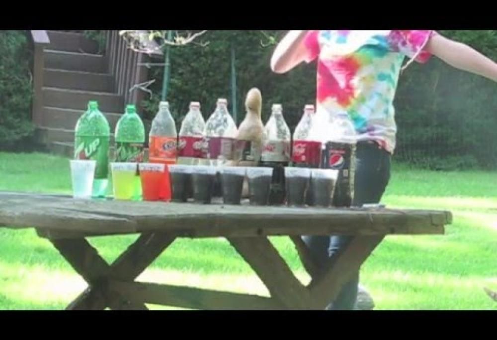 Una ragazza testa le diverse reazioni chimiche di nove bevande gassate a contatto con le Mentos.
