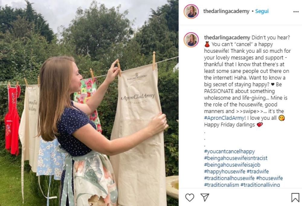 La 34enne, che prima di sposarsi lavorava nel settore marketing (e che oggi si definisce una “casalinga felice di avere come scopo quello di prendersi cura della casa e viziare il proprio marito”), ha anche aperto una scuola (The Darling Academy) per invogliare altre donne ad abbracciare la sua filosofia.