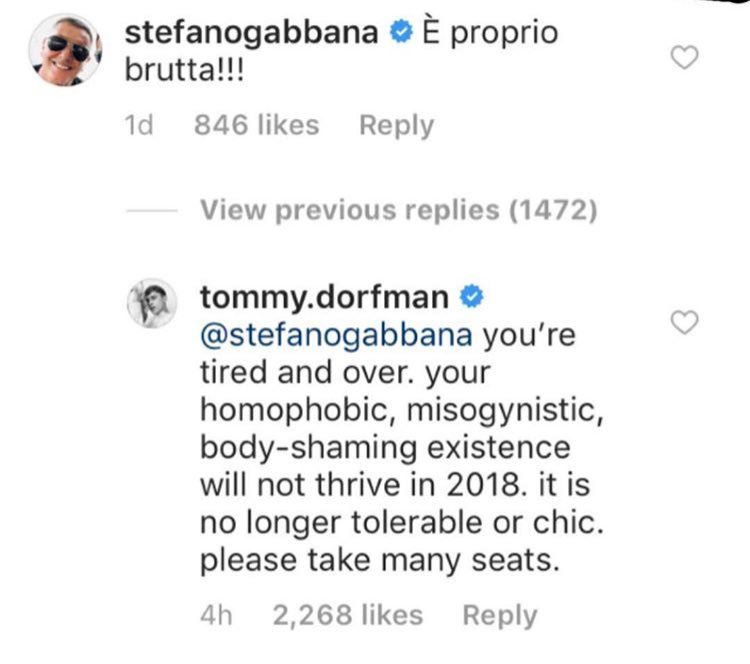Tantissime le risposte e le reazioni su tutti i social network, il cui tenore tipico era: “Ma questo si è mai guardato allo specchio?“, oppure: “Ti sei messo contro la fanbase sbagliata“. Non è la prima volta che lo stilista milanese si attira le ire del mondo del pop: ha già litigato (poi scusandosi) con personaggi come Elton John e Ricky Martin. Dovrà capitolare anche stavolta? Per ora non ci sono state reazioni ufficiali. Anzi, in un altro post ha “sfidato” i fan di Selena scrivendo: “Ciao, hater, commentate ancora, mi fate sentire importante”.