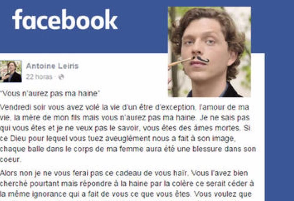 “Venerdì sera avete rubato la vita di una persona eccezionale, l’amore della mia vita, la madre di mio figlio, eppure non avrete il mio odio. Non so chi siete e non voglio neanche saperlo. Voi siete anime morte. Se questo Dio per il quale ciecamente uccidete ci ha fatti a sua immagine, ogni pallottola nel corpo di mia moglie sarà stata una ferita nel suo cuore.