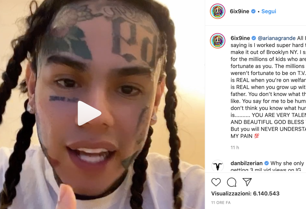 E, infine, Tekashi 6ix9ine ha postato un altro video, dove spiega ad Ariana di non avercela con lei, ma di voler parlare per tutte le persone meno fortunate, precisando: “Sei molto talentosa, sei bellissima. Che Dio ti benedica. Ma tu non capirai mai il mio dolore.“