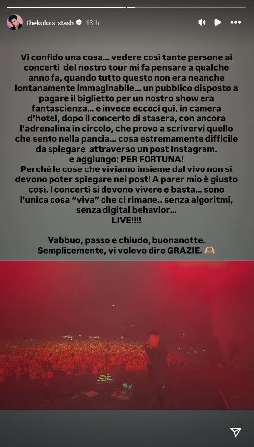 Nonostante questo successo duraturo, la band continua a sorprendersi per l’affetto del pubblico. In una storia su Instagram, dopo un concerto a Rionero in Vulture, in Basilicata, Stash ha condiviso un pensiero sincero con i fan: “Vedere così tante persone ai concerti del nostro tour mi fa pensare a qualche anno fa, quando tutto questo non era neanche lontanamente immaginabile… un pubblico disposto a pagare il biglietto per un nostro show era fantascienza” poi ha continuato: “Le cose che viviamo insieme dal vivo non si devono poter spiegare nei post! A parer mio è giusto così. I concerti si devono vivere e basta…sono l’unica cosa “viva” che ci rimane.. senza algoritmi. Volevo dirvi semplicemente grazie”.