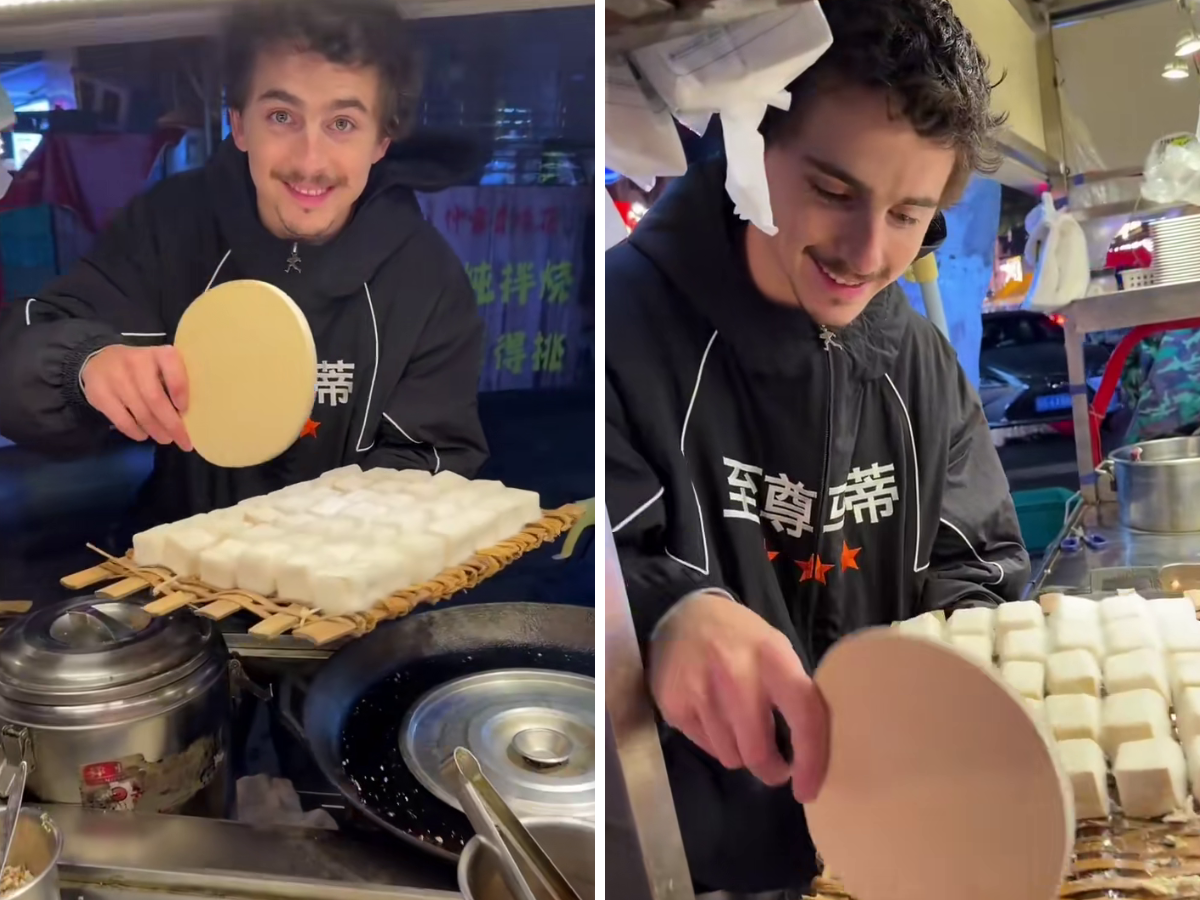 Il cibo protagonista è il mei doufu, tofu fermentato tradizionale della Cina meridionale, caratterizzato da uno strato di muffa bianca morbida che viene mescolato con spezie e peperoncino prima di essere consumato con il riso. Chalamet ha così combinato la cultura locale con un tocco hollywoodiano, omaggiando anche il suo personaggio in Marty Supreme, dove interpreta un giocatore di ping-pong.