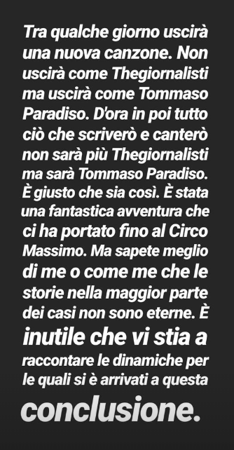 L’avventura dei Thegiornalisti pare che sia giunta a un capolinea. Ad annunciarlo, attraverso una lunga Stories su Instagram, è proprio il frontman, Tommaso Paradiso. Ecco quello che ha scritto: “Tra qualche giorno uscirà una nuova canzone. Non uscirà come Thegiornalisti ma uscirà come Tommaso Paradiso. D’ora in poi, tutto ciò che scriverò e canterò non sarà più Thegiornalisti ma sarà Tommaso Paradiso. È giusto che sia così. È stata una fantastica avventura che ci ha portato fino al Circo Massimo. Ma sapete meglio di me o come me che le storie nella maggior parte dei casi non sono eterne”.
