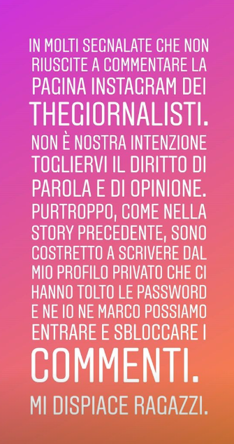Ma appresa la notizia dello scioglimento a sorpresa dei Thegiornalisti, il chitarrista Marco Rissa ha voluto replicare e si è lamentato in questo modo: “Ci hanno tolto le password del profilo ufficiale del gruppo“. “In molti – ha continuato il chitarrista – segnalate che non riuscite a commentare la pagina Instagram dei Thegiornalisti. Non è nostra intenzione togliervi il diritto di parola e di opinione. Purtroppo, come nella story precedente, sono costretto a scrivere dal mio profilo privato che ci hanno tolto le password e né io né Marco possiamo entrare e sbloccare i commenti. Mi dispiace ragazzi“.