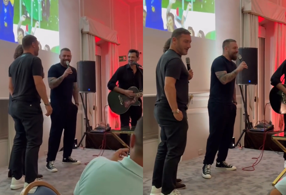 Uno dei momenti più divertenti della serata è stato il karaoke con Totti, De Rossi e Andrea Pirlo che si sono esibiti con il celebre brano Ci vorrebbe un amico di Antonello Venditti. Un brano che simboleggia anche il legame profondo tra i due ex giallorossi, che hanno condiviso un’amicizia che dura da decenni fuori e dentro al campo con i colori della Roma. La performance è stata ripresa da Noemi Bocchi ed è subito diventata virale sui social.