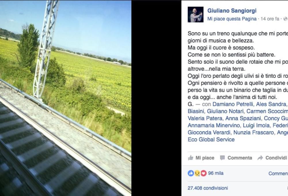 “Sono su un treno qualunque che mi porterà verso giorni di musica e bellezza – ha scritto dalla sua pagina Facebook – Ma oggi il cuore è sospeso. Come se non lo sentissi più battere. Sento solo il suono delle rotaie che mi porta altrove…nella mia terra. Oggi l’oro perlato degli ulivi si è tinto di rosso. Ogni pensiero è rivolto a quelle persone che hanno perso la vita su un binario che taglia in due la Puglia e da oggi anche l’anima di tutti noi”.