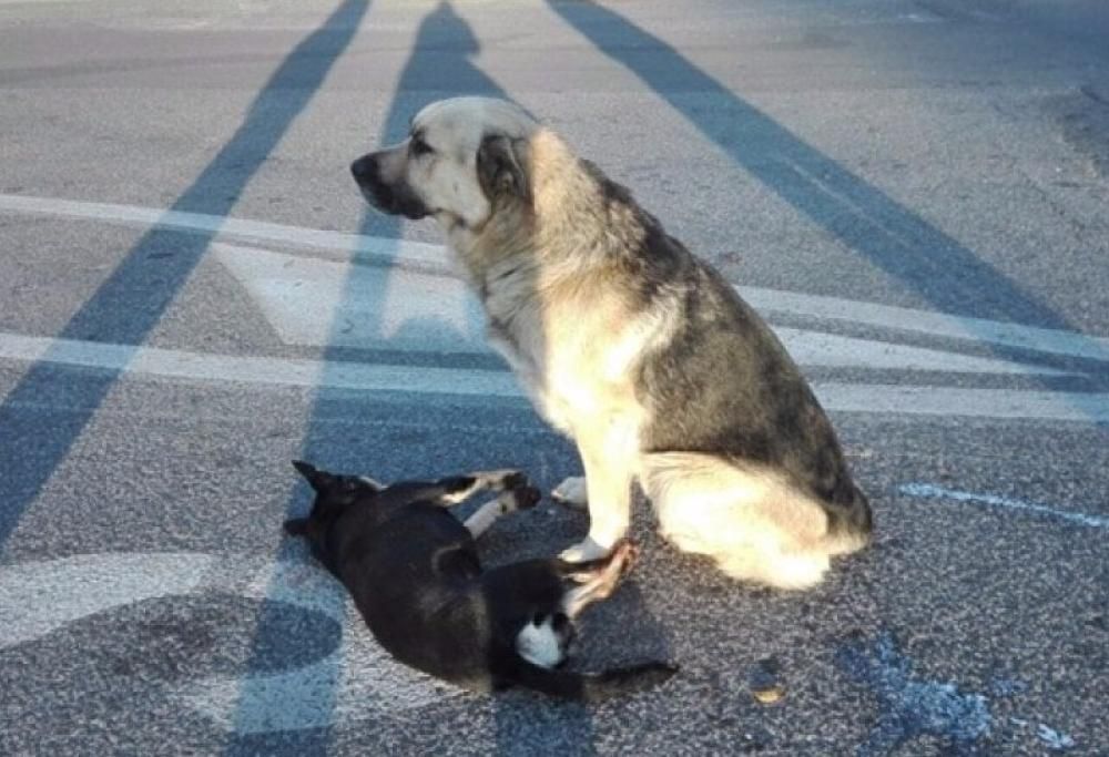 Un cane veglia l’amico investito da un’auto e non permette a nessuno di avvicinarsi
