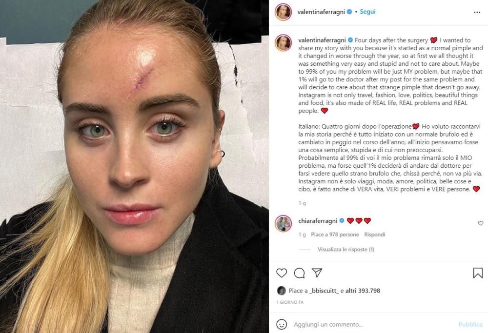 Valentina Ferragni ha appena subito un intervento di cui ancora non si conosce il risultato finale, ma che le ha lasciato un’evidente ciratrice. L’influencer, 28 anni in un post ha raccontato dell’operazione, fatta per rimuovere una formazione che aveva sulla fronte.”Inizialmente sembrava essere un brufolo sotto pelle, ma è cambiato nel corso dell’anno, peggiorando e iniziando ad ulcerarsi. Al momento non sappiamo ancora cosa sia: potrebbe essere una semplice cisti o, nel peggiore dei casi, un carcinoma basocellulare (tumore maligno MA non super aggressivo)”, Questo aveva scritto Valentina Ferragni invitando tutti a non sottovalutare i problemi di salute. Nei giorni seguenti in un altro scatto che la ritrae senza filtri ha spiegato: “Quattro giorni dopo l’operazione Ho voluto raccontarvi la mia storia perché è tutto iniziato con un normale brufolo ed è cambiato in peggio nel corso dell’anno, all’inizio pensavamo fosse una cosa semplice, stupida e di cui non preoccuparsi. Probabilmente al 99% di voi il mio problema rimarrà solo il MIO problema, ma forse quell’1% deciderà di andare dal dottore per farsi vedere quello strano brufolo che, chissà perché, non va più via. Instagram non è solo viaggi, moda, amore, politica, belle cose e cibo, è fatto anche di VERA vita, VERI problemi e VERE persone ❤️”. Una testimonianza coraggiosa, importante per molte donne che si possono immedesimare nella sorella dell’influencer e sentirsi spronate a prendersi maggiormente cura della propria pelle, anche per prevenire eventuali tumori.