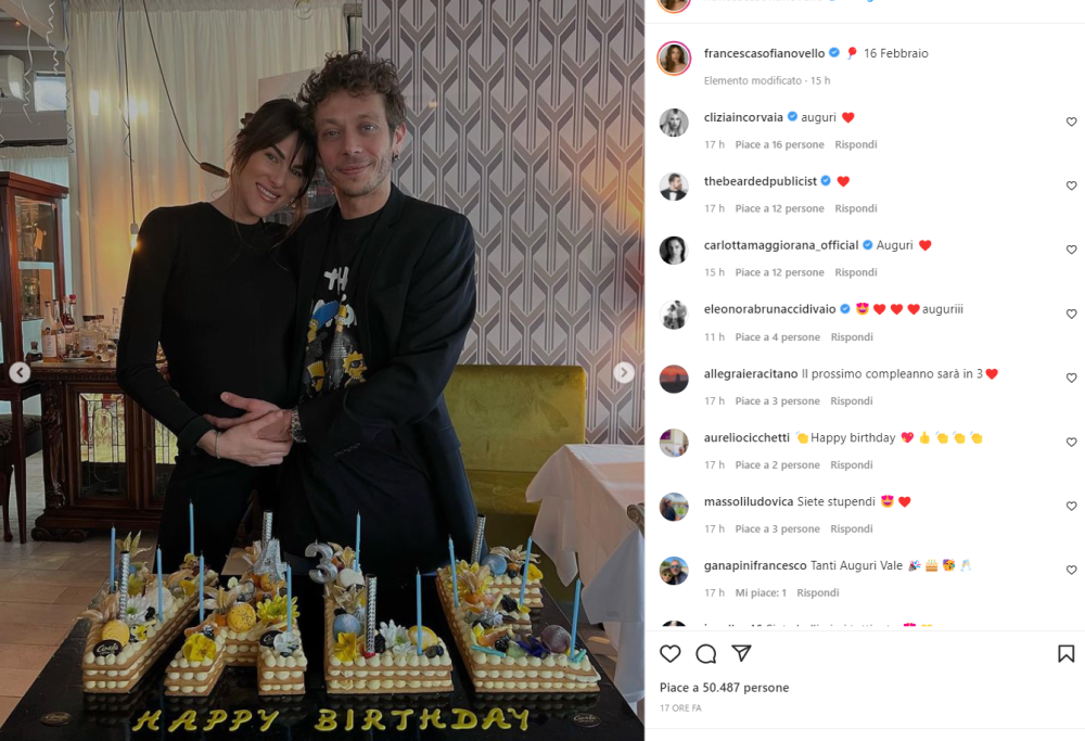 L’ex campione del moto GP Valentino Rossi ha compiuto 43 anni il 16 febbraio, ma conserva ancora la solita faccia da ragazzino furbetto. Oramai però non solo è un uomo, ma presto sarà anche papà. Il suo compleanno lo ha festeggiato proprio con la compagna Francesca Sofia Novello e con il suo pancione. I due avranno presto una bimba, la loro primogenita. La data del parto è prevista per fine febbraio e il nome della piccola è già deciso, ma top secret.