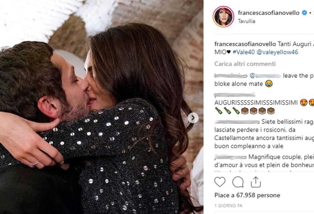Ma tra gli scatti della festa, ce ne sono alcuni che hanno fatto il giro del web: si tratta delle immagini che ritraggono Valentino Rossi e la sua compagna Francesca Sofia Novello, modella 25enne, che si scambiano un tenero bacio.