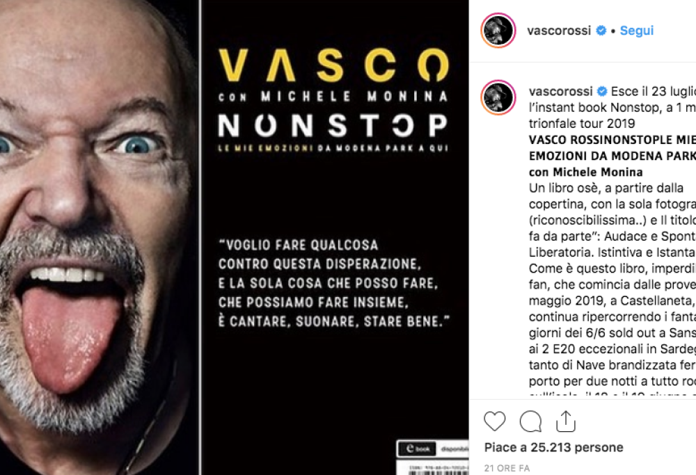 Esce il 23 luglio l’instant book Nonstop, a 1 mese dal trionfale tour 2019 – si legge nel post su Instagram – Un libro osè, a partire dalla copertina, con la sola fotografia (riconoscibilissima..) e Il titolo che “si fa da parte”: Audace e Spontanea. Liberatoria. Istintiva e Istantanea. Come è questo libro, imperdibile per i fan, che comincia dalle prove di maggio 2019, a Castellaneta, e continua ripercorrendo i fantastici giorni dei 6/6 sold out a Sansiro fino ai 2 E20 eccezionali in Sardegna con tanto di Nave brandizzata ferma in porto per due notti a tutto rock sull’isola, il 18 e il 19 giugno scorsi. Un instant book, scritto live e in contemporanea, si può dire.  Una sorta di appunti di viaggio, raccolti da Michele Monina qua e là, prima e durante il tour, da Castellaneta fino a Cagliari. Riflessioni a caldo e chiacchiere a ruota libera, impossibile non passare dalla svolta epocale di Modena Park prima di entrare nel nuovo Vasco – Non Stop (finora novecentomila partecipanti alla festa da giugno 2018/2019). Per ora. E poi domani, chi lo sa, si vedrà… ‘Chi vivrà vedrà'”.