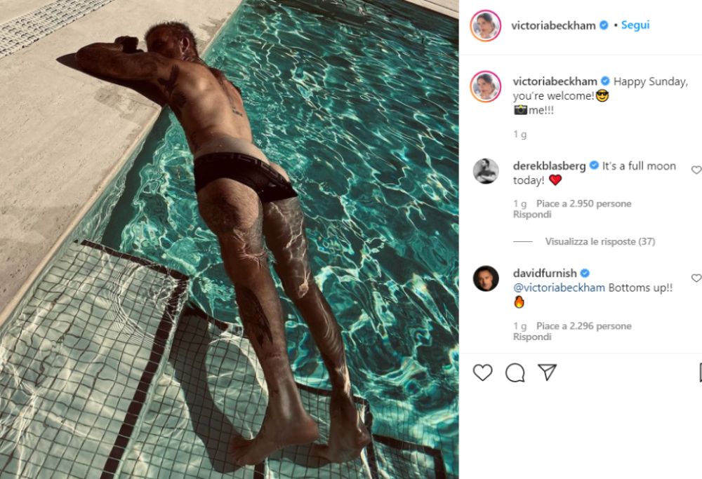 Con un marito così, è facile vantarsi come ha fatto Victoria Beckham che domenica scorsa ha pubblicato una foto di David Beckham in una posa mozzafiato. Lui è disteso a bordo piscina a pancia in giù con un costume che generosamente mostra un sedere scolpito e un fisico in formissima: 46 anni e non sentirli!