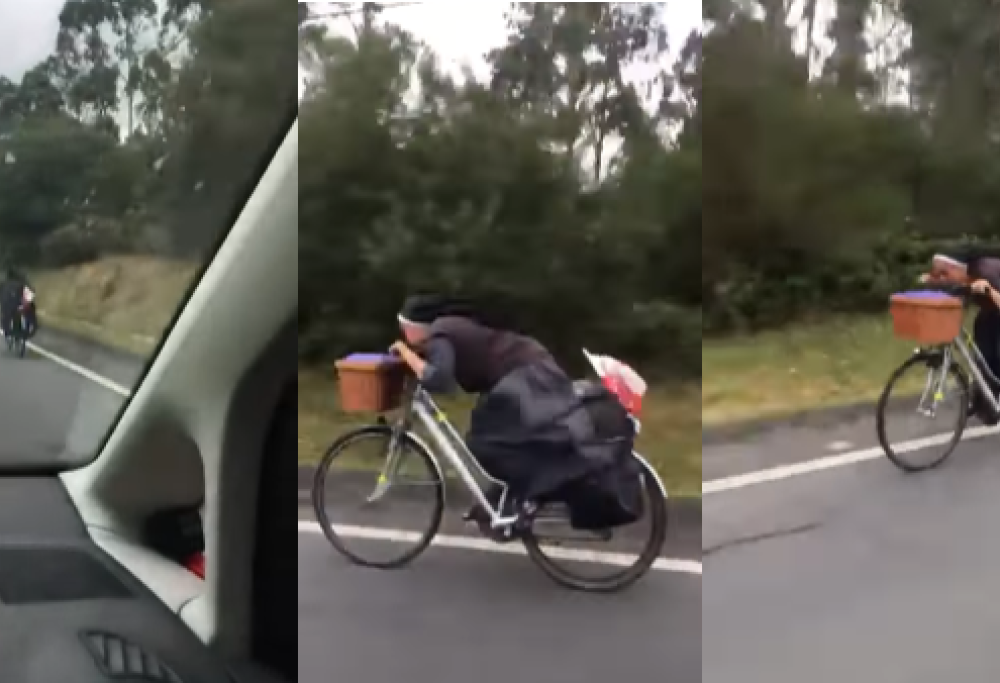 La religiosa si è lanciata in posa aerodinamica sulla bici per prendere velocità. Il video è subito divenuto virale.