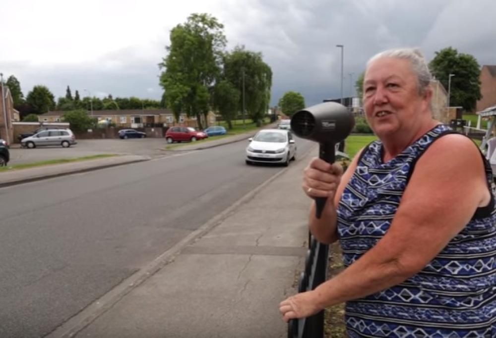 Jean Brooks, una nonna di 64 anni di età residente a Nottingham, nel Regno Unito, ha avuto un’idea formidabile, per la quale è stata anche intervistata dalla BBC. La donna infatti, preoccupata per l’alta velocità alla quale sfrecciano le auto di fronte casa, ha pensato ad un modo per far rallentare gli automobilisti. Come? Brandendo un semplice phon per capelli al passaggio delle auto, in modo da sembrare che stia rilevando la velocità, insomma un autovelox umano. Come ha affermato lei stessa, l’idea le è venuta in mente per proteggere i suoi nipoti e gli altri bambini del vicinato dalle auto.