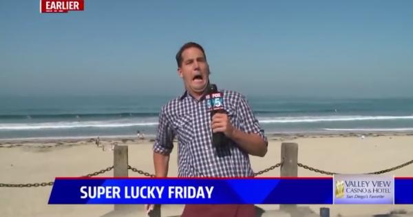 Brad Willis mentre esin diretta su FOX 5 dalla spiaggia di San Diego è stato assalito da un insetto gigantesco.