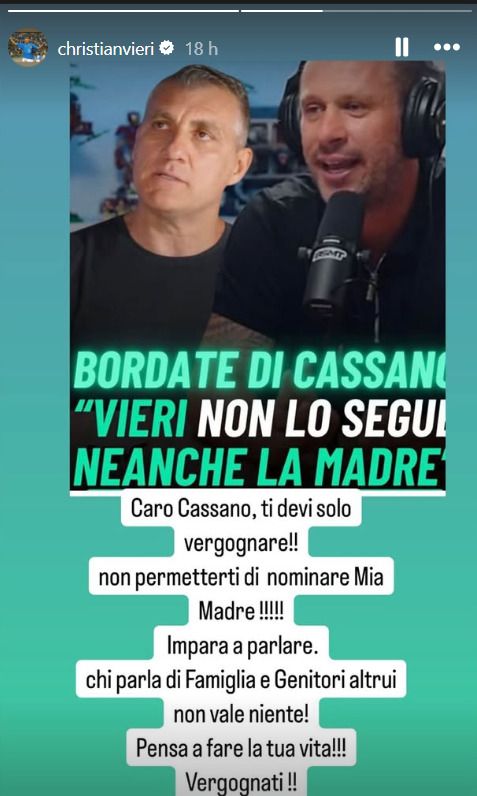 Con una storia su Instagram, Vieri dà sfogo a tutta la sua rabbia: “Caro Cassano, ti devi solo vergognare! Non permetterti di nominare mia madre! Impara a parlare. Chi parla di famiglia e genitori altrui non vale niente! Pensa a fare la tua vita! Vergognati“. Parole durissime rivolte a Fantantonio, che appena tre giorni fa aveva fatto nuovamente commenti poco lusinghieri verso Vieri in occasione della consegna del Tapiro d’Oro da parte di Valerio Staffelli.