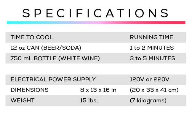L’idea crowfunding accolta con successo è stata rivelata alla conferenza sulla tecnologia CES di Las Vegas questa settimana e i creatori hanno mostrato che può raffreddare una lattina di birra (o bibita) in un paio di minuti e un’intera bottiglia di vino in circa cinque minuti.