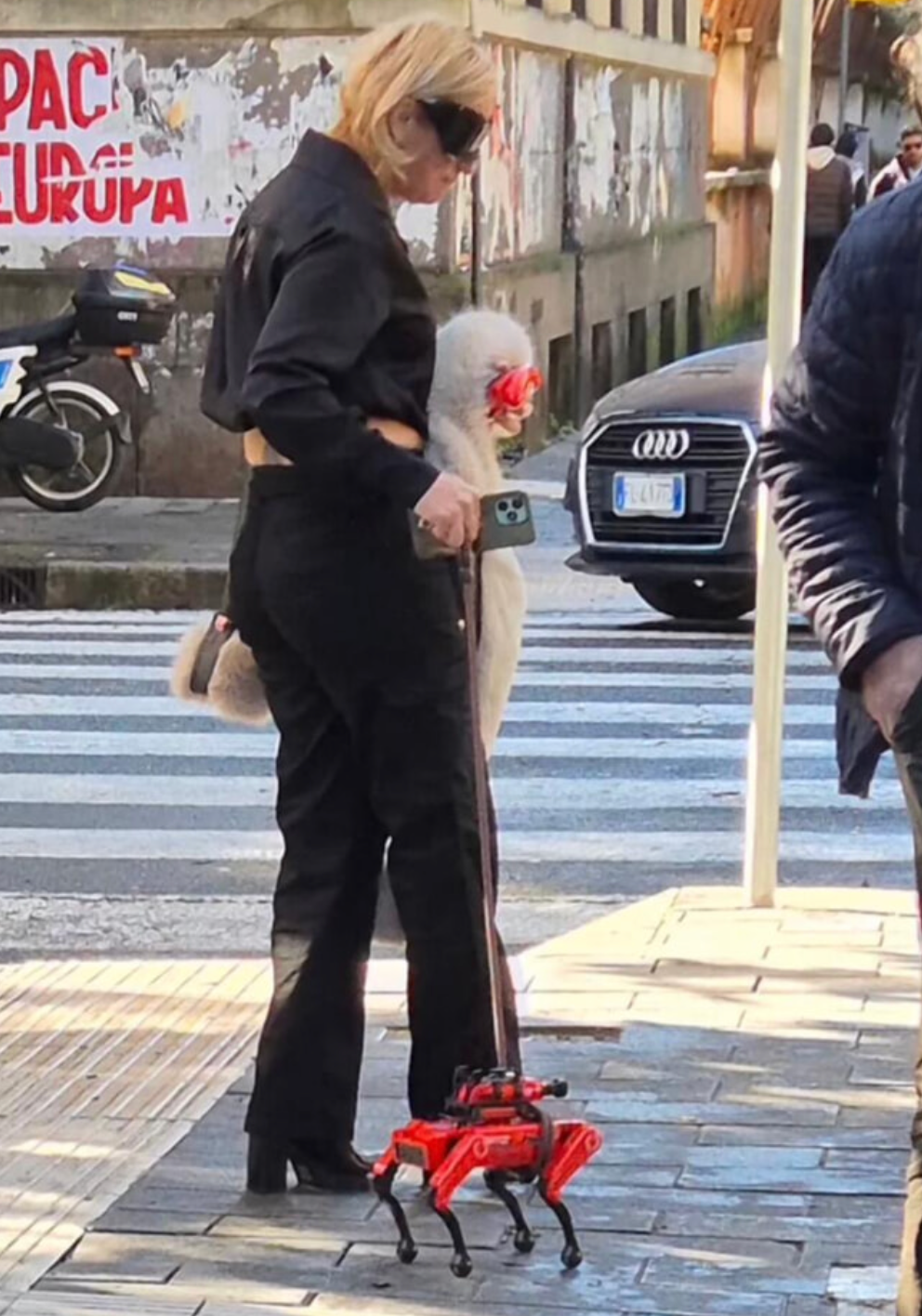 La signora a passeggio, di origine brasiliane, è stata sorpresa mentre era in compagnia del suo cane robot, di colore rosso accesso e opportunamente tenuto al guinzaglio come si conviene con i simili in carne, pelo e ossa.